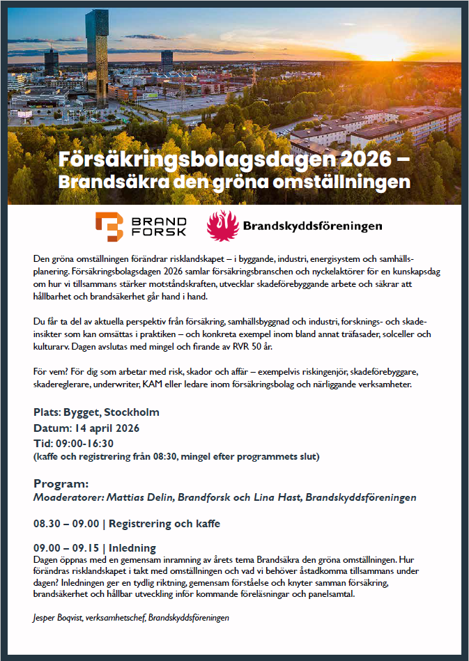 Den 14 april samlar vi försäkringsbranschen för en dag fylld av aktuella ämnen och inspirerande samtal om framtidens risker och möjligheter. Årets tema – brandsäkra den gröna omställningen – en utveckling som både öppnar dörrar och skapar helt nya utmaningar för skadeförebyggande arbete och egendomsskydd.